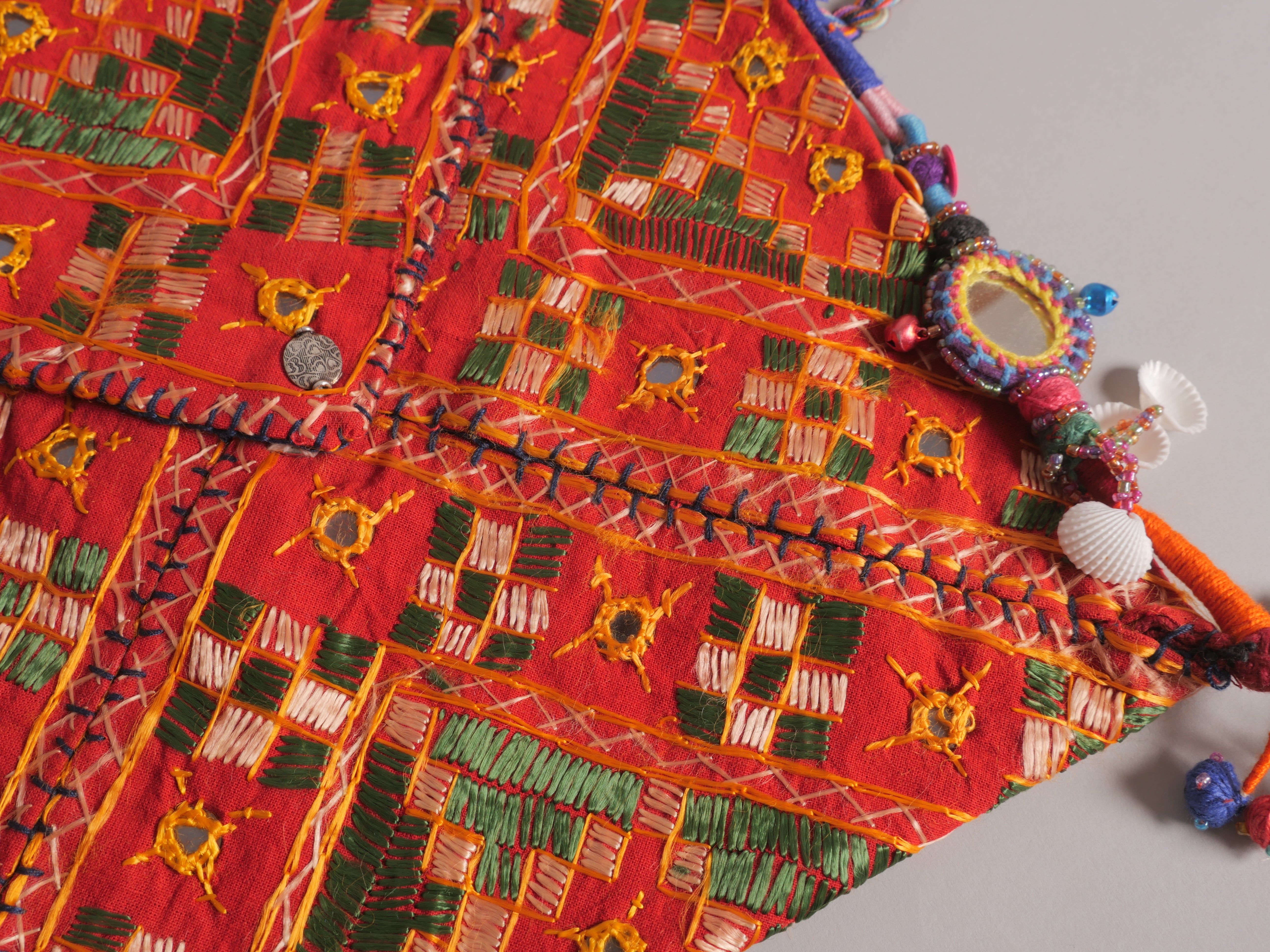 L'histoire :  La culture indienne accorde une grande importance à l’art, en particulier à la tradition de la broderie, riche en symboles et en motifs, parmi différentes communautés. Dans le district de Bhavnagar, le peuple Kharak est reconnu pour sa broderie unique, une pratique enracinée dans l’histoire et la tradition régionales. La broderie des femmes Kharak, distinguée par ses motifs animaliers colorés et ses designs imaginatifs, combine souvent des éléments d’animaux et d’oiseaux différents, démontrant un style créatif rare. Ces motifs, absents il y a un siècle, sont désormais une marque d'identité culturelle pour la communauté Kharak, différenciant leur broderie de celle des autres castes.