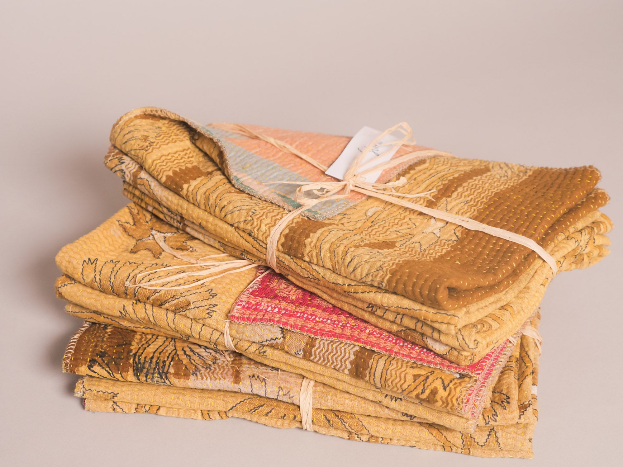 Produit : Pack de 2 sets de tables réversibles en coton vintage. Réalisés à partir d'anciens saris. Fait main par des artisans, les petites imperfections attestent du fruit d'un travail artisanal manuel. Face avant, divers tons ocre avec des images de fleurs étoilées. Le verso est variable, avec des tons bleu-beige et quelques rouges.