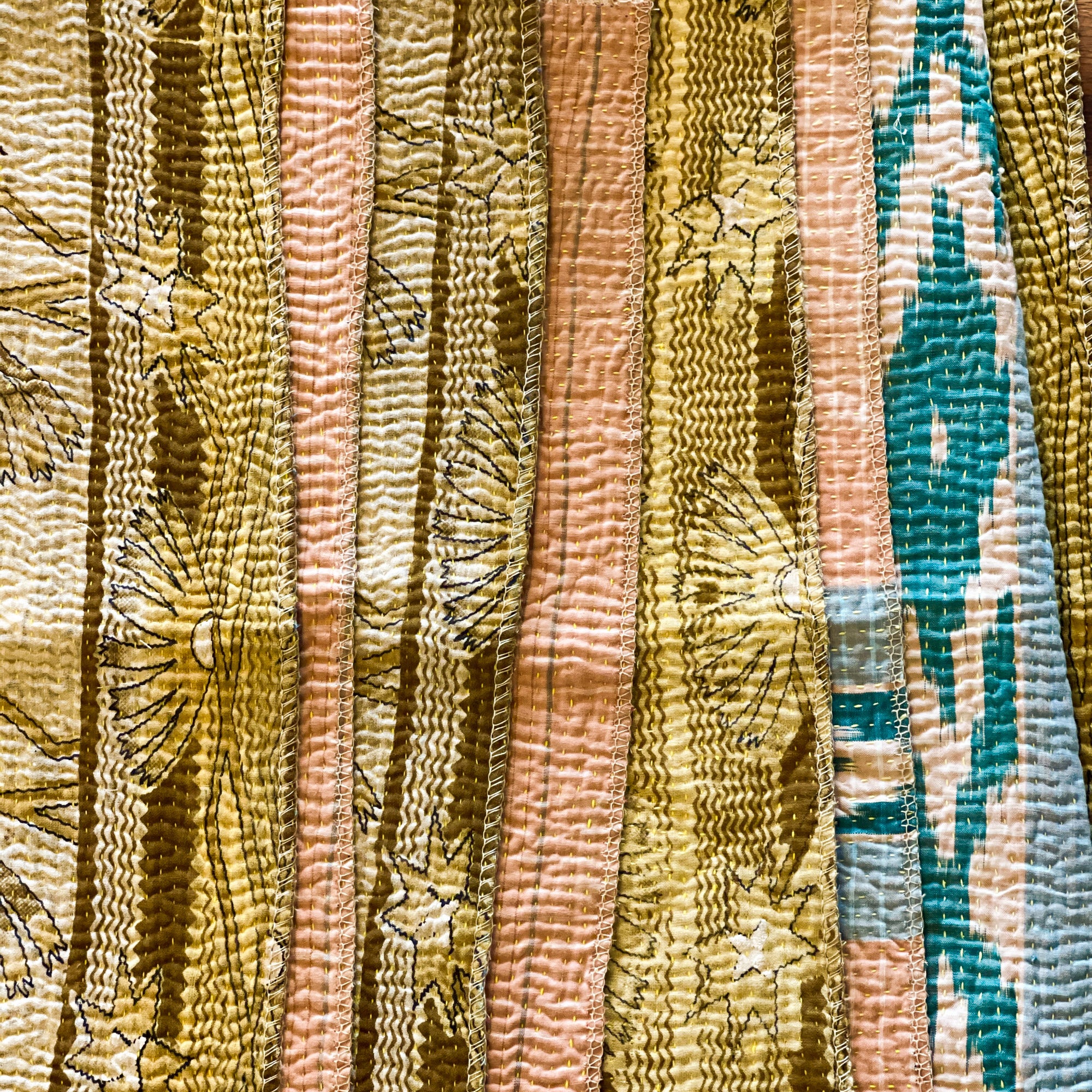 Le mot Kantha vient du sanscrit "Kontha" qui signifie "chiffons". C'est un art millénaire inscrit au patrimoine immatériel de l'Humanité de l'UNESCO. Les paysannes du Bengale assemblent plusieurs couches de vêtements usés, le plus souvent des Saris, qu'elles brodent au point pour en faire des couvertures ou des couvres-lit. Dans les villages, après les travaux des champs et de la maison, les femmes se rassemblent, sans considération de caste ou de religion, pour peindre à l’aiguille et faire vibrer les couleurs. La broderie devient un véritable liant sociale pour ces femmes dont les conditions sont précaires. Ce travail d’exception leur procure autonomie financière et amélioration de leur statut au sein de la communauté.